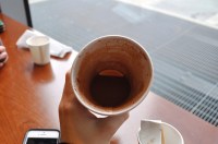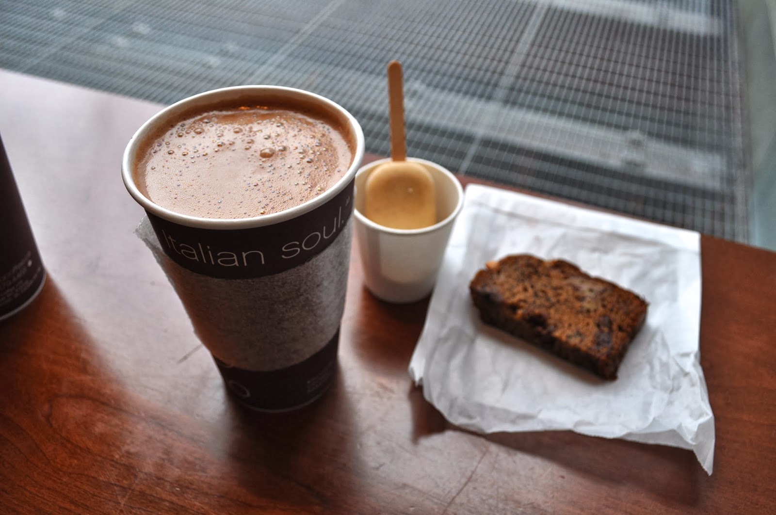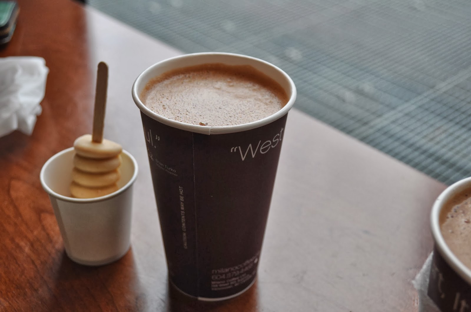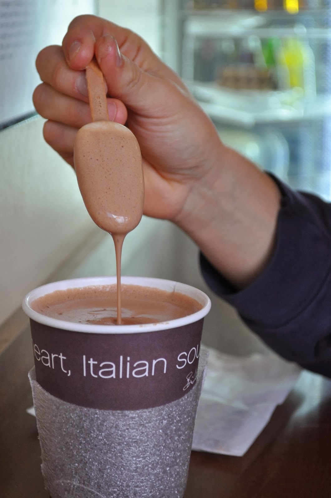 3/4 of the way through the beverage, the lost and unstirrable chunk of gelato could be swirled into the hot chocolate with a couple swooshes of the cup. The caramel now became evident and cancelled the rough dark chocolate texture and the drink became smooth and creamy.