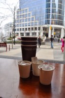 The “gBAR” mentioned in the description is the frozen gelato bar; this is where the specific flavours of each of the 6 available hot chocolate festival items come from. The beverage comes as a more-or-less basic hot chocolate of varying darkness with soy and almond milk options available, and the gBAR is then stirred into the hot chocolate. My company and I each chose a different beverage flavour – Mine, the Evita; hers, Monkey’s Uncle; his, the London Foggy.