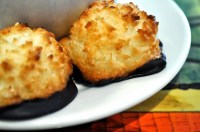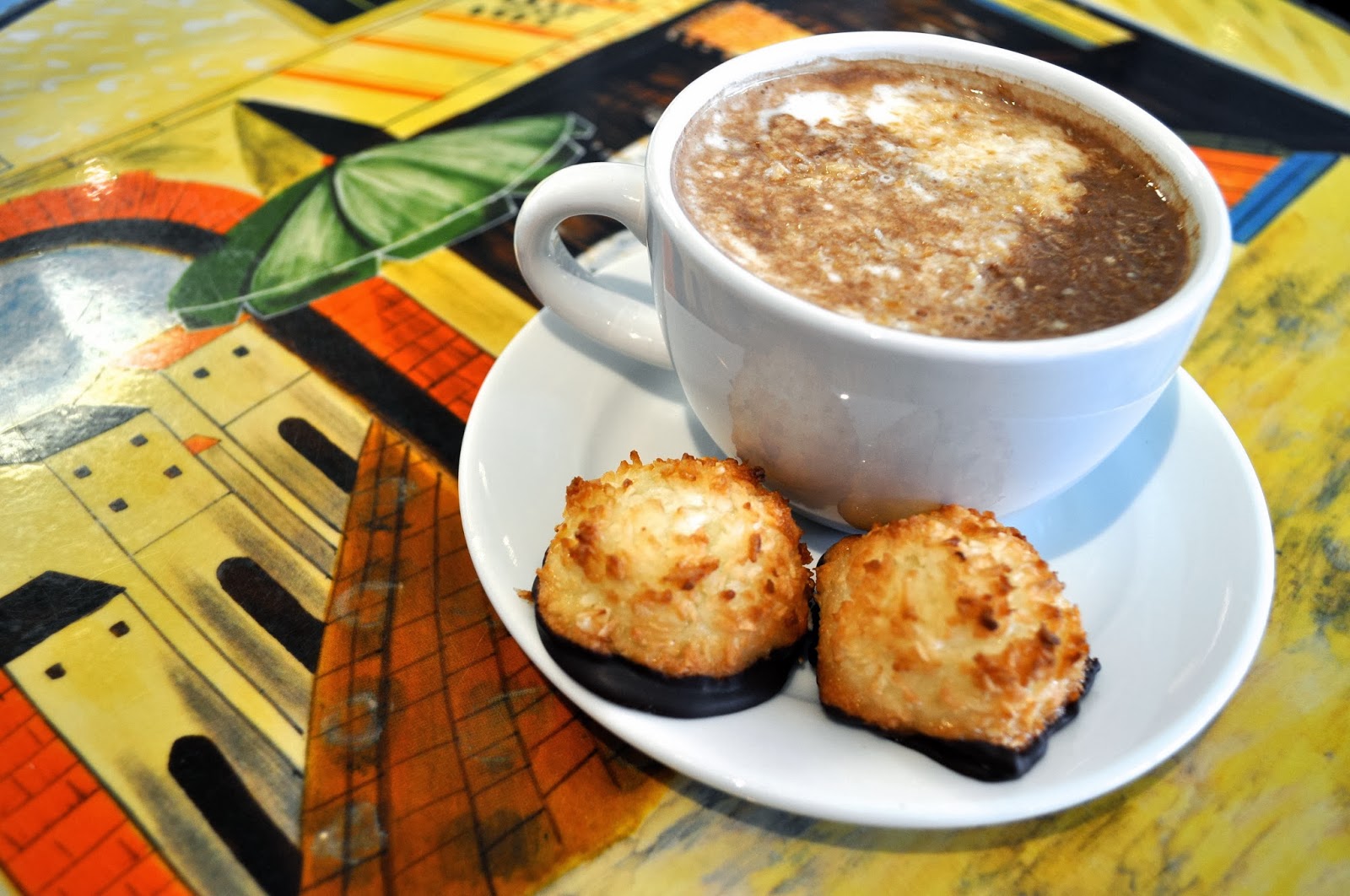 The dark taste of the chocolate settled on the back of my tongue, while the sweetness of the coconut milk and coconut shavings settled on my tongue’s tip. I had expected the drink to be thick and heavy, but it was instead surprisingly light and not overly filling; the macaroons took care of that aspect for me. If you are a fan of coconut flavour, this whole drink and snack experience should be very enjoyable! There are no hidden undertones or overtones or extra flavours thrown in – it is hot chocolate made with coconut milk, and it is great (speaking as a fan of coconut). The beverage was simple and, with its treats, made for a nice afternoon snack. The macaroons were sweet and full of chewy coconut texture, and the chocolate-dipped portion added some smoothness to each bite.