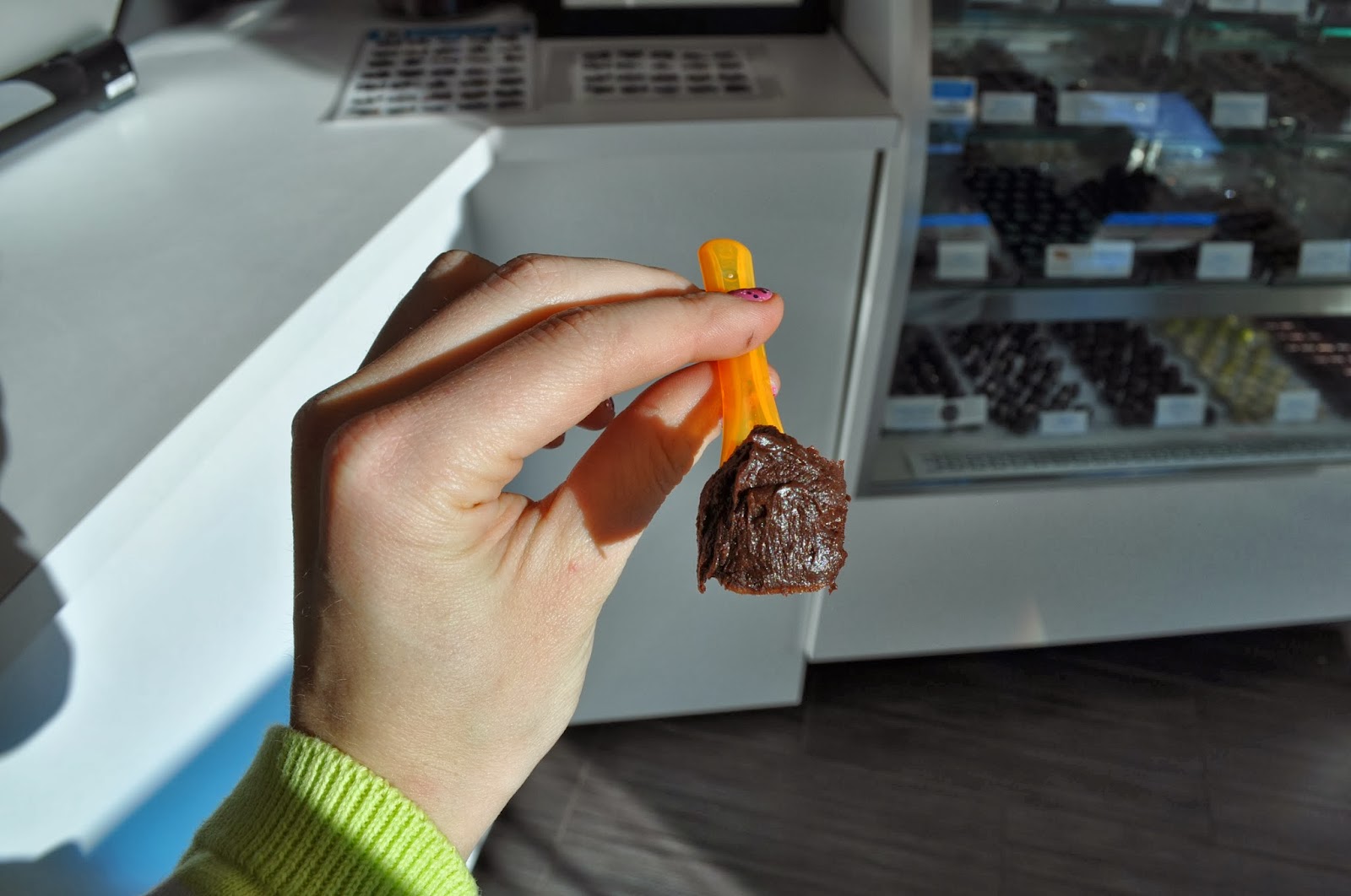 The beverage was consumed with slight haste, as the sun was shining directly into the store window and was melting our chocolate and making it feel quite like summer time. Once complete, we turned our attention to Glenn, and I asked how he creates a black licorice-flavoured hot chocolate; his response was lengthy and sounded very impressive. Though I do not recall the process, I do know that he expressed his wishes for me to have tried it with almond milk, because it would have been a lighter milk and may have showcased the flavour a bit more. Kindly, again, he shared the raw ganache with us – prior to being added to a drink – and I think it would have been very good with almond milk!