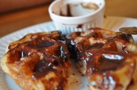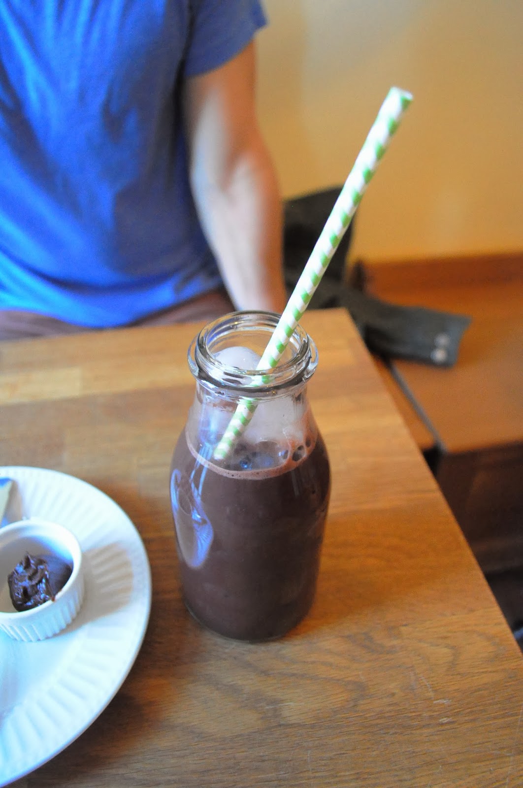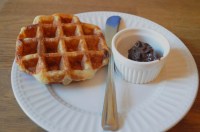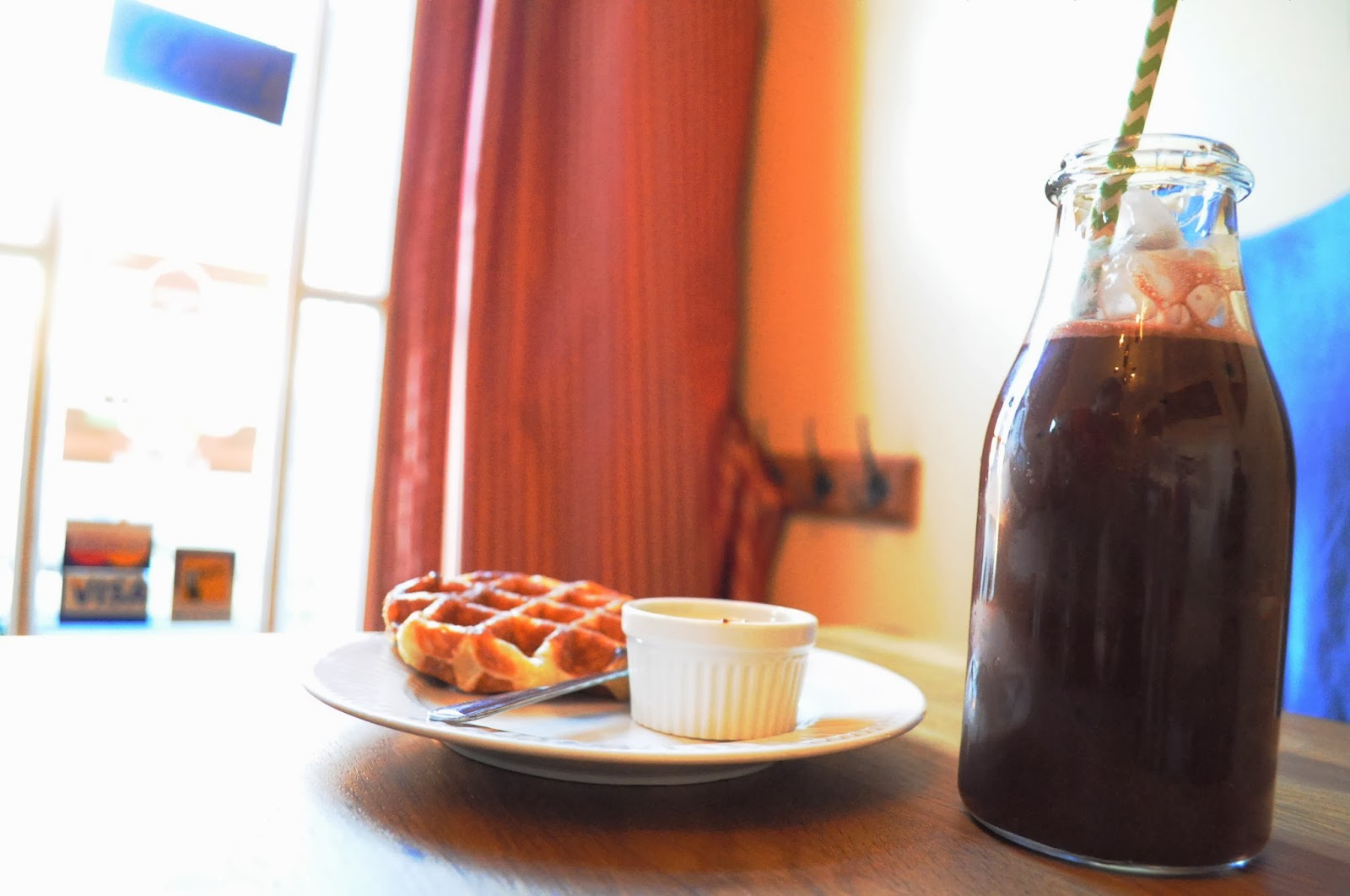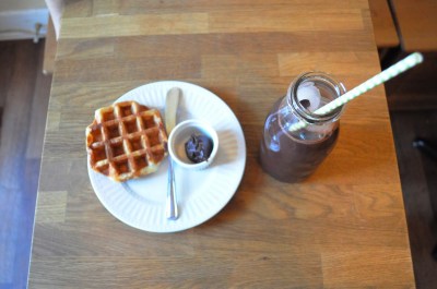 Served in a small milk bottle, our beverage arrived over ice with a stripy straw – it looked great! The waffle served alongside came warm with our selected chocolate hazelnut spread. Noted by the enthusiastic shopkeep (I think she must have been the owner), this waffle is not your average American or Canadian square waffle that is heated in a few minutes in a waffle pan or popped into a toaster; this waffle has been readying to be eaten 48 hours ahead of time, all the while becoming the delicious entity that it was on our plate.