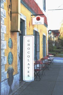 The shoppe is very small and quaint, and the woman who helped us with our choices and questions was enthusiastic and French and eager to describe the options to us! If you look at the photo of me (looking slightly crazy with chocolate love) and what is behind me: picture twice that space, and you have the entire visitor space in the shop! There is a back room for waffle-making and chocolate-creating, but I love how it is so small and homey feeling. I didn’t try any of the chocolate confections that were displayed, but I certainly would like to return to the little neighbourhood and give it a go! It’s a colourful area of town full of old buildings and places like this!
