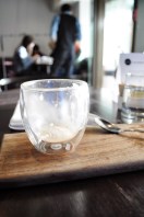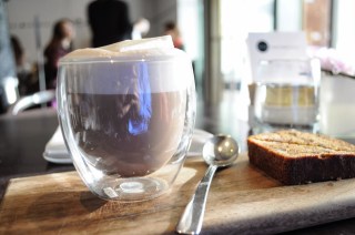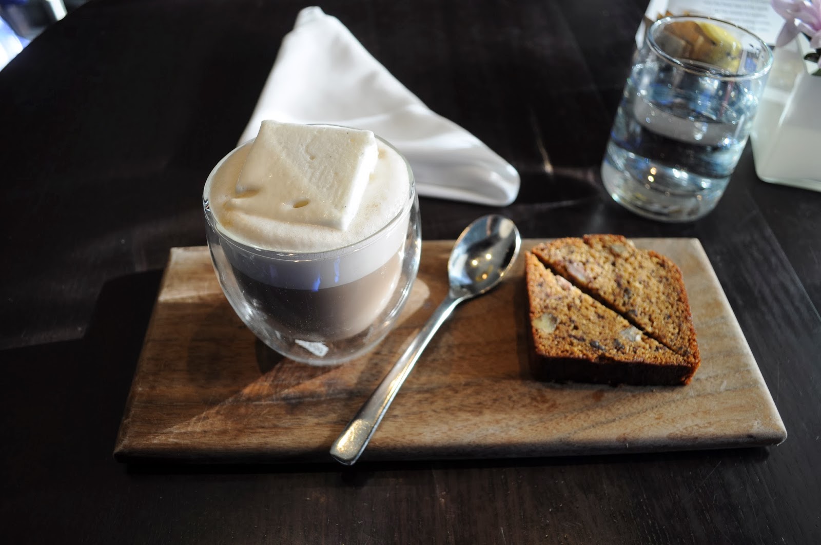 The cafe has a very modern and “chic” feel to it; dark wood and brown furnishings, very soft blue walls with simple polka dot designs darting across them. This is also the first cafe I’ve really encountered where a sign tells me to wait to be seated! So I did wait, and I was seated, and I was handed a menu and spotted the hot chocolate festival item, the Banana Split. The description differed from the one on the City Food festival’s page, but I was there for a purpose and this alternative sounded equally as delicious! I inquired as to whether it was possible to get this one with a dairy alternative, and the kind waiter recommended almond milk; of course I went with his suggestion.![]() |