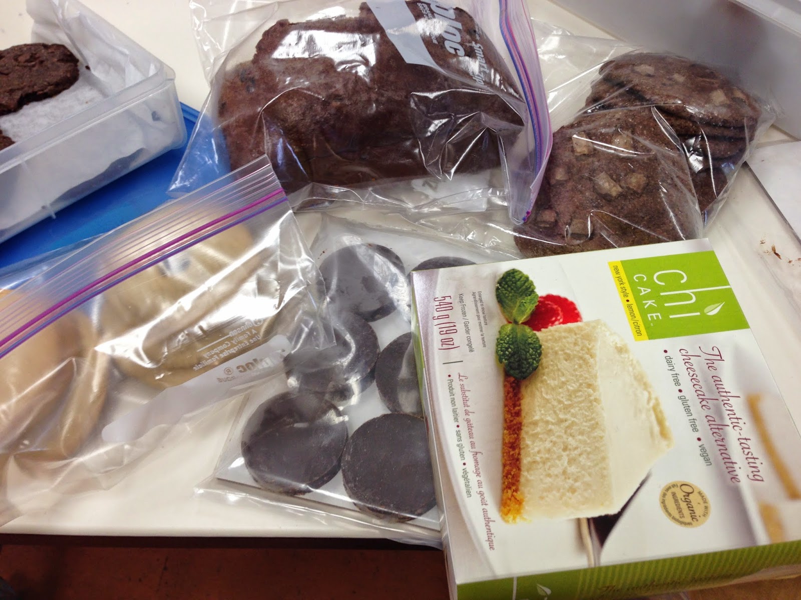 | Double-chocolate chip cookies, key-lime cookies, peanut butter pucks, chocolate chip banana bread, and Chi Cake – all vegan/healthy/gluten free! |