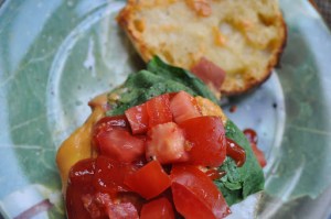 Mom’s eggy breakfast with Daiya cheese and veggies for me! |