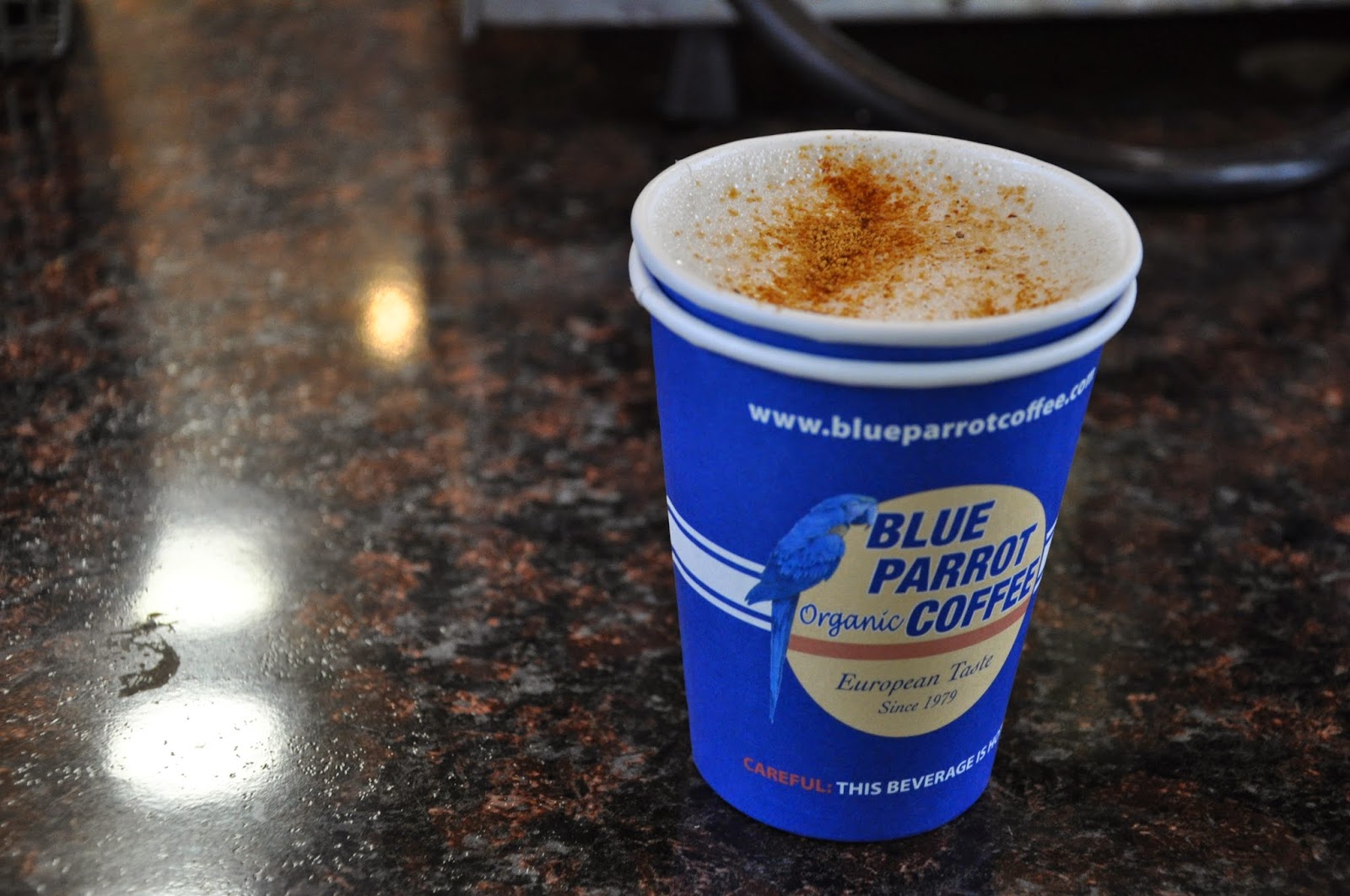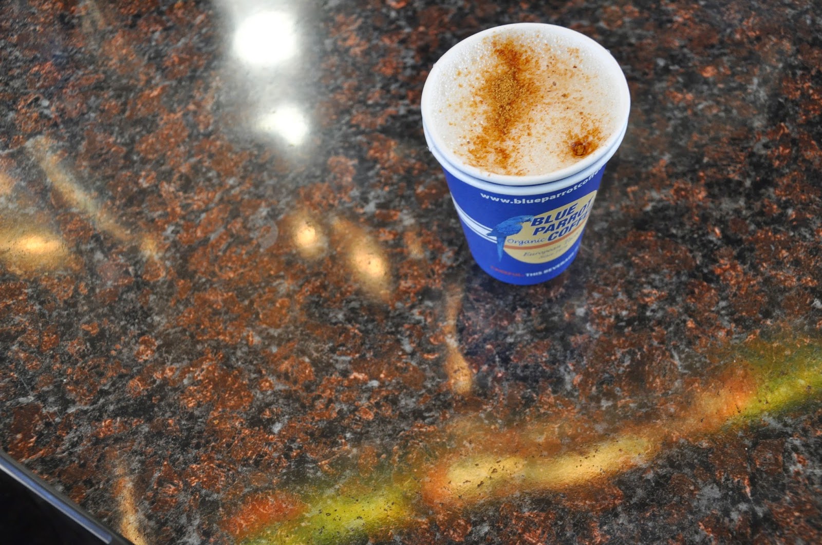 Since I spent the weekend with my family, I recognized that baking another item during the weekend would be unlikely to be eaten (since my family eats small quantities of everything), so I decided to go for a pumpkin item while I was out, instead. I went to the Blue Parrot Cafe for a nice light steamed almond milk with pumpkin pie flavour!
