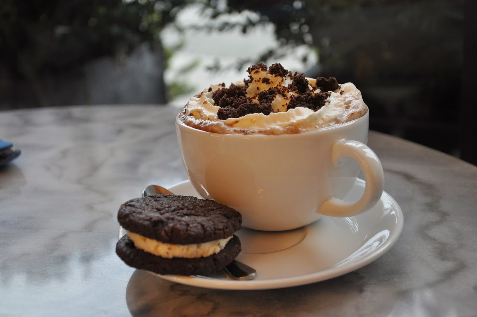 Butter Baked Goods aren’t about that store-bought way of life – they do things their way in their ovens. These “oreos” are made by BBG and for this cocoa, they crumbled them atop the hot chocolate. Made with soy milk, J and I shared a drink with a delicious miniature cookie on the side (the full-sized ones are about three of this wee bites). The cocoa had crumbs and chocolate chunks throughout the drink as the crumblings fell through the surface – it was creamy, had that magical Oreo-chocolate taste, and was enjoyed in the most adorable of locations! They make an abundance of delicious-looking baked goods, including banana bread, lemon loaves, cake, date squares, brownies, large home-made “Oreos”, and many, many more. It was like sitting down in a doll house, and the service was incredibly friendly. Highly recommended if you enjoy Oreos! (website)