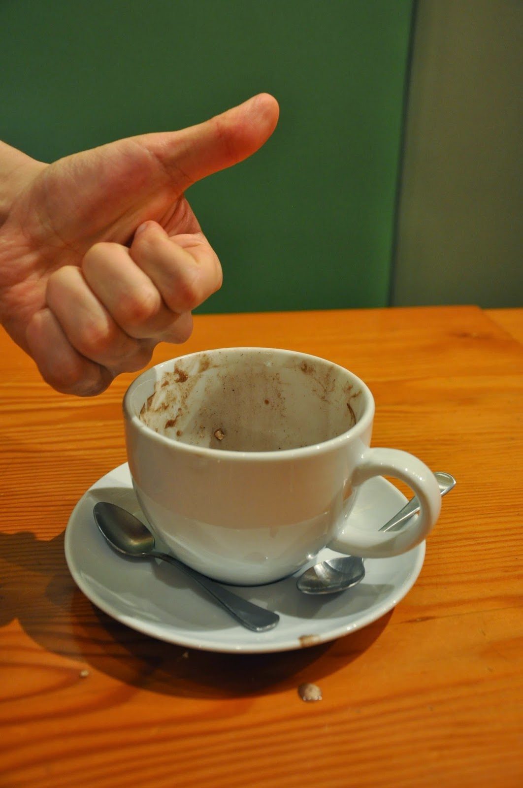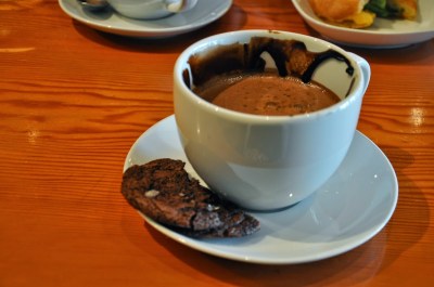I have been to 49th Parallel in the past, but not for their hot chocolate before – I was (am) excited to see that their two locations near school were participating for the festival this year! Their three offerings included a regular dark hot chocolate with a doughnut of your choice, the Nainamo Bar: dark chocolate with butter icing sweetened milk with a small doughnut on the side, or my choice, The Lumberjack: spicy dark hot chocolate with two maple marshmallows and a chocolate-dipped log.