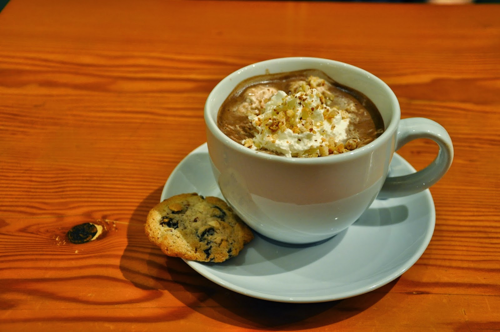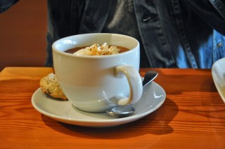 This hot chocolate was enjoyed in the company of AB the January Vegetarian, while he had the Stollen Kisses hot chocolate (discussed later). Mine was a fairly simple hot chocolate, but was mixed with a balsamic vinegar and decorated with a cocoa balsamic glaze. The sweetness of the chocolate with the tanginess of the balsamic was beautiful, and the cookie was incredibly chewy and delicious. I had mine with almond milk, and that did lighten the texture of the drink from what it would regularly be, I think. I would recommend this if you prefer your sweets to be balanced with a less-sweet flavour. (website)
