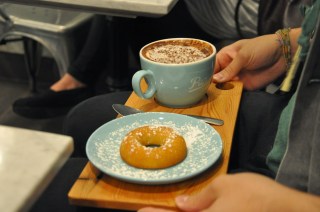 The hot chocolate was light due to the almond milk I requested, and that made the spicy notes stand out amidst the dark chocolate. I did not indulge in the marshmallows much, but could smell their sweet maple flavour. A chocolate-dipped log? It was obviously delicious (but more descriptively, it was flaky and a little bit chewy with sugar and finished nicely with the slowly-melting dark chocolate on the end). (49th website; doughnuts website)
