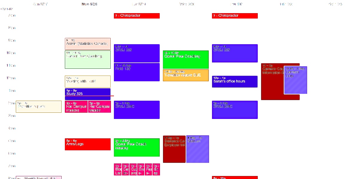I am not sure if my love for scheduling has resulted from my affinity for organization and efficiency, but I do know that seeing a week of scheduled events, meetings, and study times really helps me focus myself and prioritize what needs to be done more effectively.