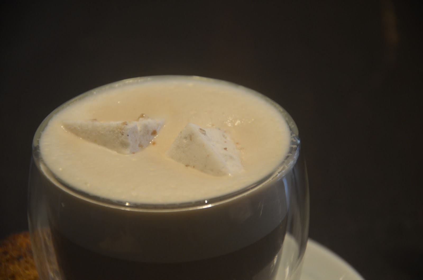 As is my usual, I ordered an almond milk option, and think that this may have served me well in lightening the drink up in terms of sweetness and richness. Even with the almond milk, which sometimes causes flavours to blend somewhat less effectively, the drink was incredibly smooth in texture and flavour. It had two toasted pecan marshmallows floating inside it, which I tried a bite of and left behind (because vegetarian diets don’t technically include marshmallows); the marshmallows were fun to chew on with the pecan bits inside.