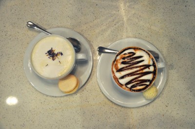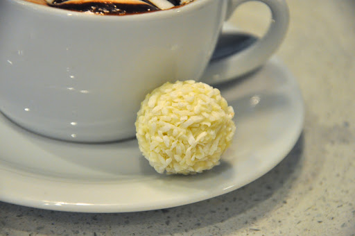 The Peach Perfect was white chocolate with peachy tones and lavendar on top – it was very sweet, but was super delicious and the soy milk worked well with it, really making it a full-mouth experience. Its accompanying peach macaron was so great I can barely put words to it! It did not have a creamy type of filling, but rather seemed like a peach jelly, and tasted fresher than you might expect in a macaron.The Sourpuss, on the other hand, was mostly a standard hot chocolate on the inside, until the topping – a sour berry and dark chocolate mixture – sank through the foam and mixed its way into the drink. This was a much darker drink but was a nice complement to its sweeter sibling. The coconut truffle was chocolaty on the inside and had a great crunch before hitting the soft flavour within.