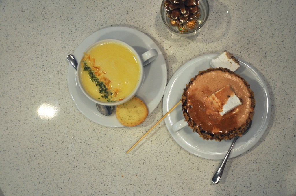 Without much refined chocolate-tasting expertise, I cannot place what some of the flavours were in this dark drinking chocolate, but it was good! It tasted more or less like drinking chocolate that had been melted. The pastry that it was served with was very good, and reminded me somewhat of a doughnut and/or a croissant – it had a fun, airy and chewy texture going on, and tasted good when paired with the miniature chocolate bar that also came with it.